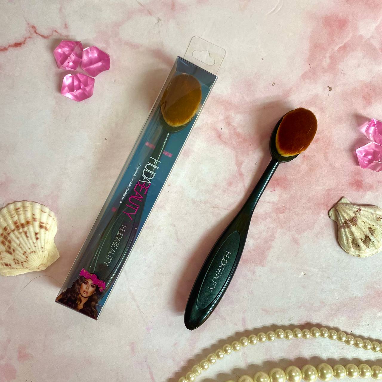 - ✨Brocha ovalada de maquillaje Huda Beauty, diseñada para lograr una aplicación uniforme y profesional de bases líquidas, cremas o polvos compactos.