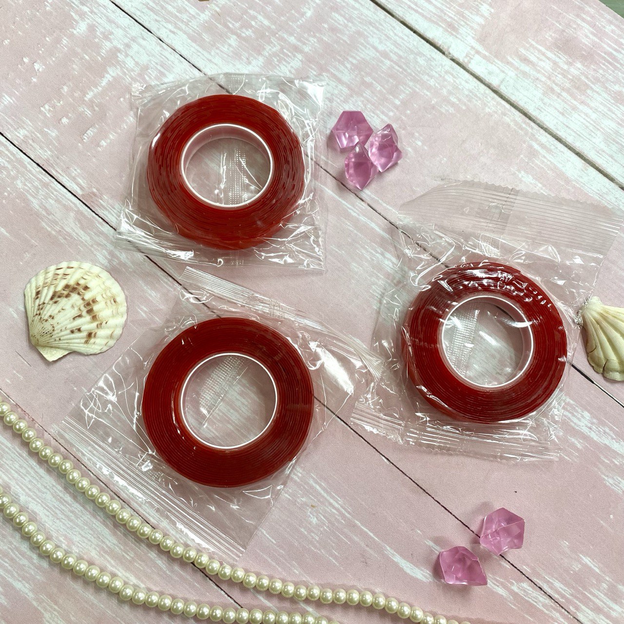 - ✨Cinta Adhesiva de Doble Cara Transparente con Liner Rojo de un ancho delgado, y su función principal en el contexto de la manicura es la fijación temporal y de exhibición de uñas postizas.