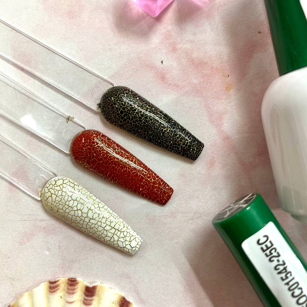 - ✨Este esmalte especial se aplica sobre una capa base de color, y al secarse se fractura de forma natural, revelando el tono del fondo.