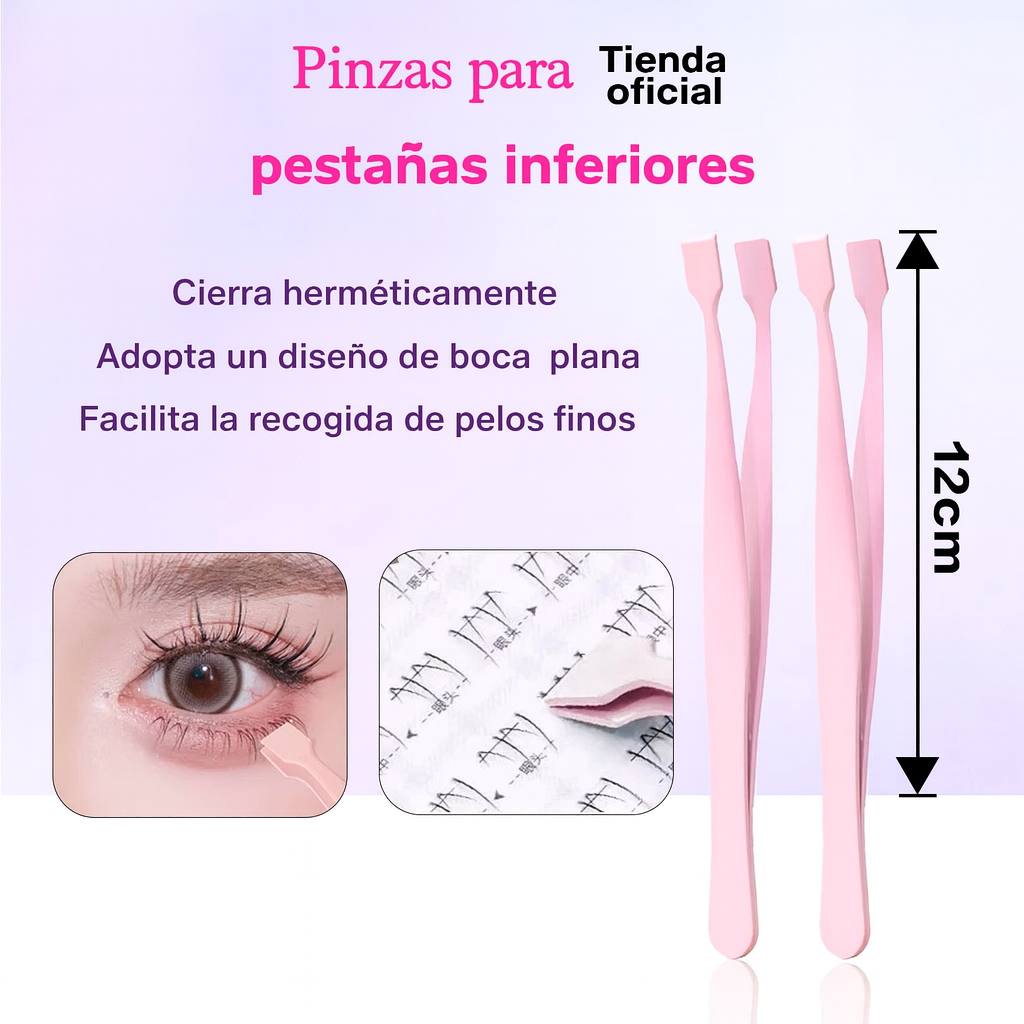 - ✨Estas pinzas especializadas están diseñadas para trabajar con precisión en la colocación de pestañas inferiores, ofreciendo un control total y un acabado limpio.